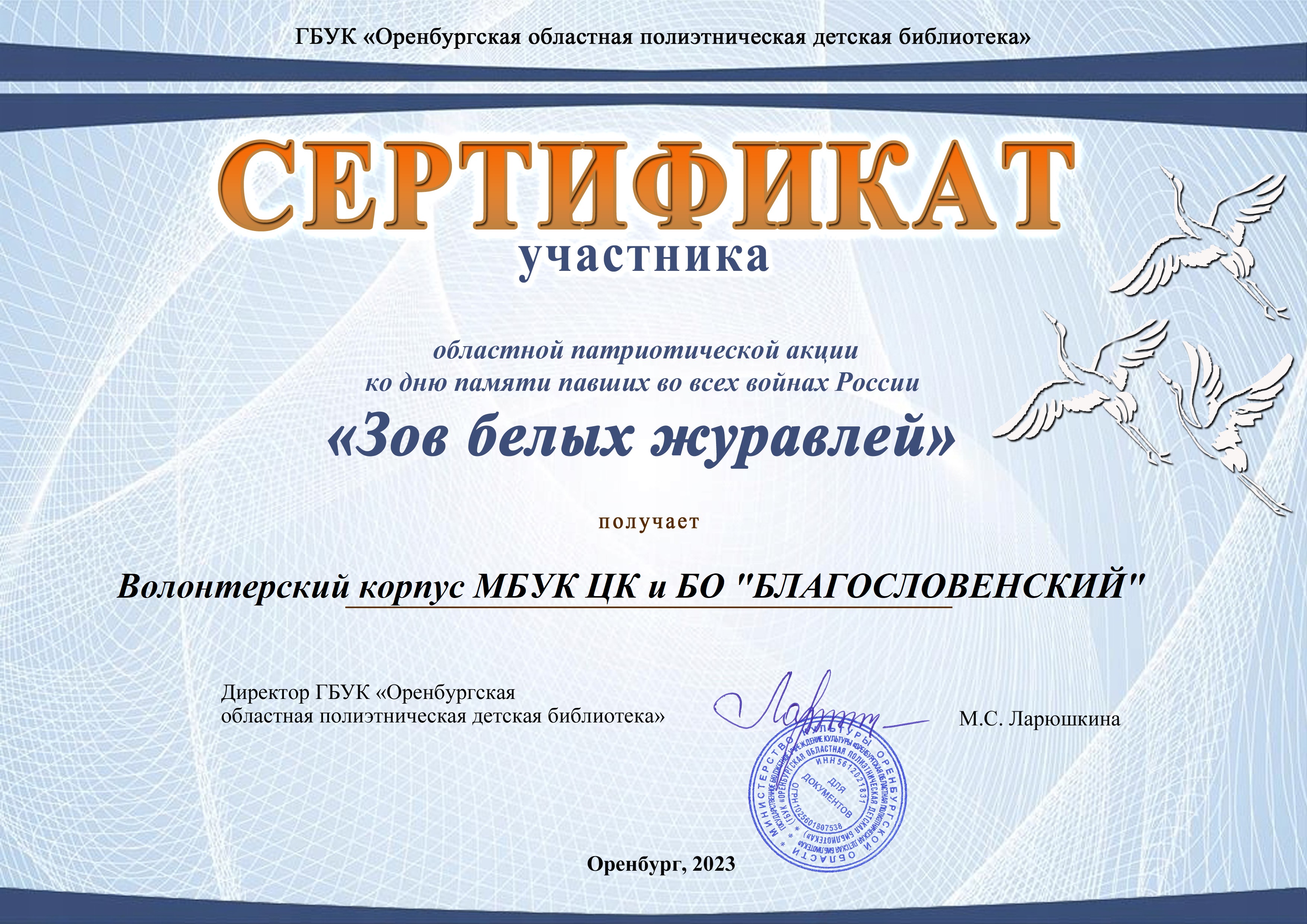 За участие в областной акции "Зов белых журавлей" , ребята волонтёрского корпуса МБУК ЦК и БО "Благословенский" награждены сертификатом участника.